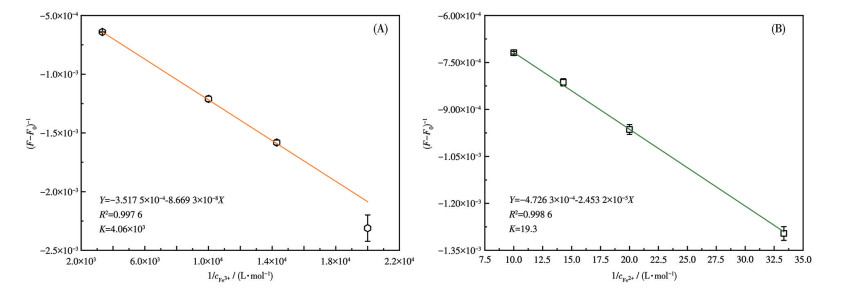 为进一步研究Fe3+针对Fe2+的选择性猝灭的内在机理,图S6显示了高浓度Fe2+(1~100 mmol·L-1)对vCDs的荧光猝灭,相应的荧光发射光谱如图S7所示。结果表明,高浓度的Fe2+(Fe3+的1 000倍)才能引起vCDs的荧光猝灭。用Benesi-Hildebrand方程测定并计算了vCDs与Fe3+和Fe2+的结合常数(图 6)。方程如下所示: