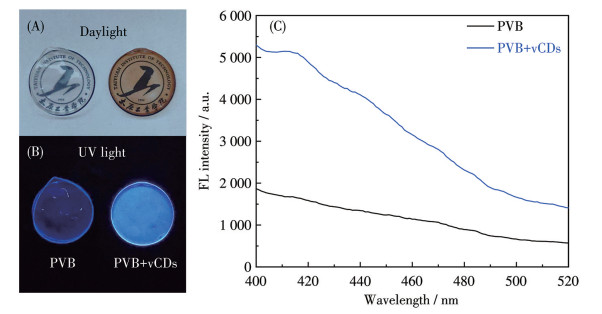 图 7  PVB膜和PVB+vCDs薄膜在(A) 日光和(B) 紫外光照射下的照片以及(C) 荧光发射光谱