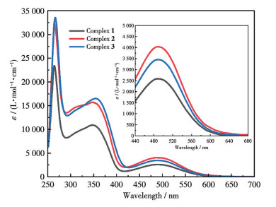 图 2  配合物1~3在DMSO中的紫外可见吸收光谱图