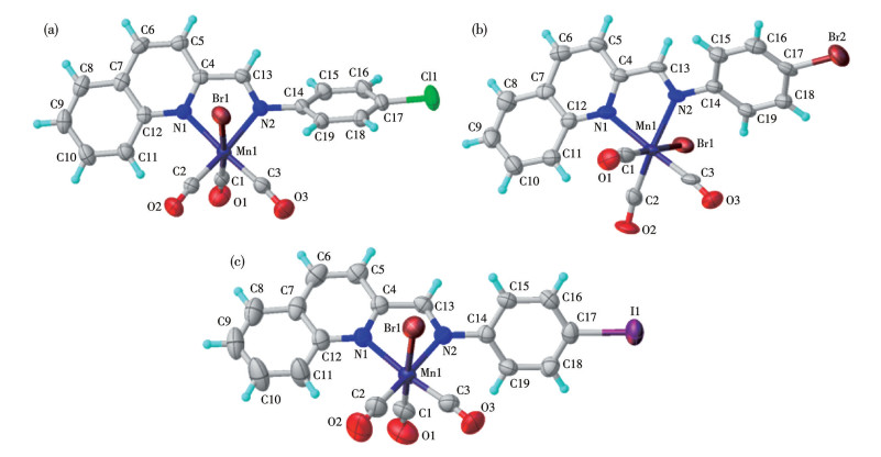 采用单晶X射线衍射技术对配合物1~3的结构进行了测定,其晶体学数据和结构精修参数见表S1,主要键长和键角参数见表S2。结构分析表明所有配合物的锰中心均呈现六配位的扭曲八面体构型(图 3),配位环境由3个羰基配体(CO)、1个溴离子(Br-)以及2个氮原子(N1、N2)构成。其中,N1来自喹啉环的吡啶氮原子,N2来源于席夫碱配体的亚胺基团(—CH=N—)。八面体的赤道平面由2个螯合氮原子(N1、N2)和2个羰基碳原子(C2、C3)组成,溴离子与另一个轴向羰基分别占据八面体的2个顶点位置。键长分析显示,轴向Mn—C键(Mn—C1)长度随卤素取代基变化呈现规律性递增趋势:0.179 8 nm(1,X=Cl) < 0.180 3 nm(2,X=Br) < 0.182 1 nm(3,X=I)。这种键长差异与卤素原子的电负性(Cl > Br > I)及配体给电子能力密切相关,预示着这些配合物随着Mn—C键长度的增加,其金属和羰基间化学键更容易断裂,导致其CO释放速率会更快,后文的红外和可见光谱实验结果也证实了这一点。