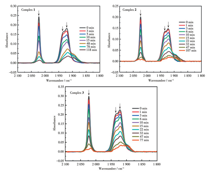 图 4  在LED红光作用下, 配合物1~3的DMSO溶液的红外光谱随时间变化图