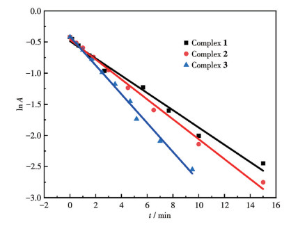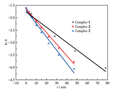 图 5  在LED红光照射下, 配合物1~3的DMSO溶液的红外光谱吸光度(2 022 cm-1处)的自然对数和时间的关系图