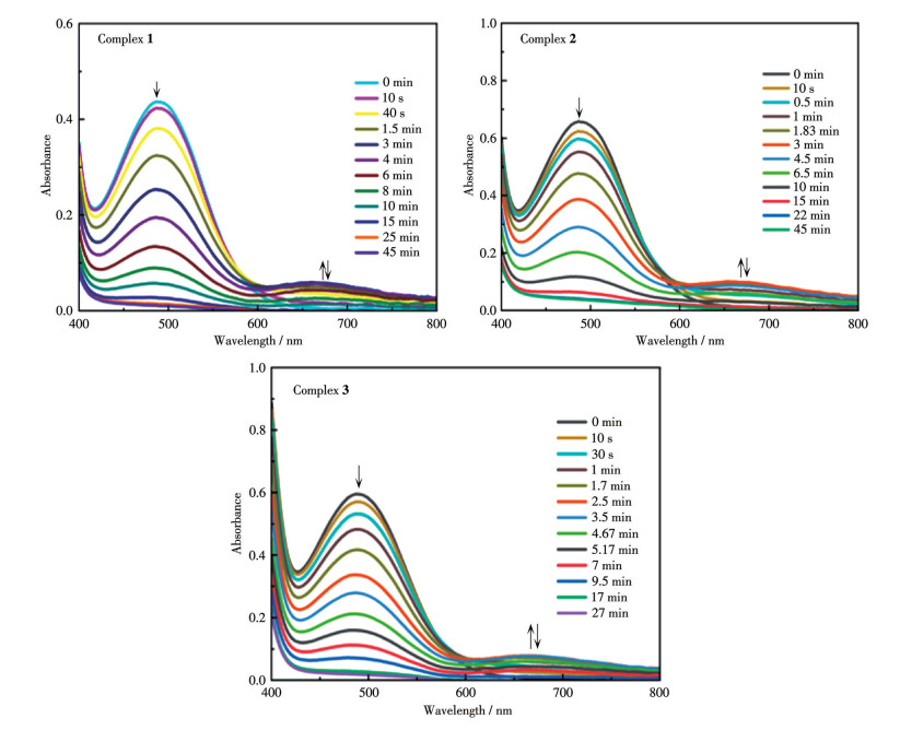 Figure 6  Changes of the visible absorption spectra of complexes 1-3 under red light in DMSO