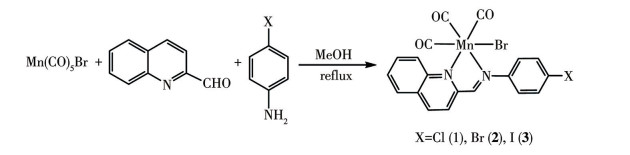 锰是人体必需微量元素,其羰基配合物因优异的光响应特性被广泛用于构建photoCORMs。席夫碱作为具有生物活性的配体在配位化学领域具有重要地位,其金属配合物在生物医药领域展现出广阔应用前景[26]。本工作将具有较大共轭结构的芳香席夫碱配体引入锰羰基配合物中,预期可以赋予配合物良好的生物性能,并提高其光化学性能。我们采用一步法将五羰基溴化锰与不同卤代芳胺以及喹啉-2-甲醛在甲醇中回流,成功合成了含席夫碱配体的锰羰基配合物[Mn(CO)3(quino(CH=N)phX)Br],其中X=Cl (1)、Br (2)、I (3)。这些配合物在低能量LED红光照射下能够快速分解释放CO,展现出作为photoCORMs的应用潜力。