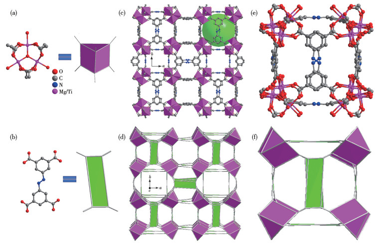 • Figure 1  Structure of Mg2Ti-ABTC: (a) trinuclear [Mg2Ti(μ3-O)(COO)6(H2O)3] cluster and simplified triangular prismatic SBU; (b) H4ABTC ligand and simplified rectangular SBU; (c) 3D framework; (d) soc topology; (e, f) cuboidal cage