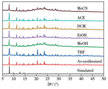 Figure 2  PXRD patterns of the simulated, as-synthesized, and soaked Mg2Ti-ABTC in different organic solvents