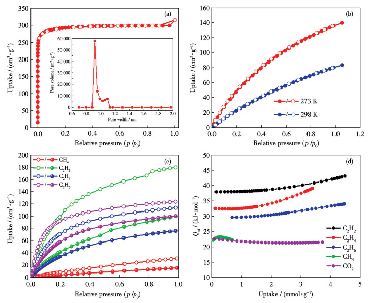 Figure 3  (a) N2 adsorption-desorption isotherm at 77 K (Inset: pore size distribution); (b) CO2 adsorption isotherms at 273 and 298 K; (c) CH4, C2H2, C2H4, and C2H6 adsorption isotherms at 273 K (hollow line) and 298 K (solid line); (d) Isothermal heats of CO2, CH4, C2H2, C2H4, and C2H6 calculated by using the viral method