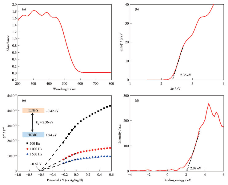 Figure 4  (a) Solid-state UV-Vis diffuse reflection spectrum of Mg2Ti-ABTC; (b) Bind gap calculation according to Tauc plot; (c) Mott-Schottky plots for Mg2Ti-ABTC in 1.0 mol•L-1 Na2SO4 (Inset: schematic diagram of the CB and VB energy levels); (d) VB-XPS curve
