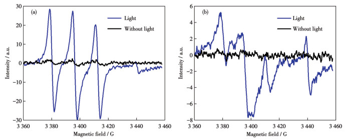Figure 5  EPR spectra of Mg2Ti-ABTC to detect 1O2 (a) and •O2- (b) using the DMPO and TEMPO trapping agents with light on and off