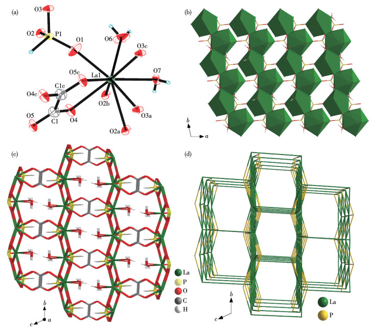 Figure 2  (a) 50% ellipsoid representation of the asymmetric unit of La-2; (b) Polyhedral view of the La-oxalate 2D layer; (c) 3D open framework constructed with 2D layers and H2PO3- groups viewed along the b-axis; (d) sqp network with a {44, 66} point symbol