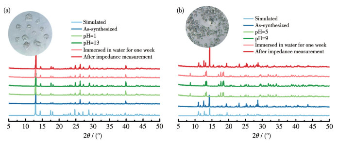 Figure 3  Simulated and experimental PXRD patterns of La-1 (a) and La-2 (b) under different conditions