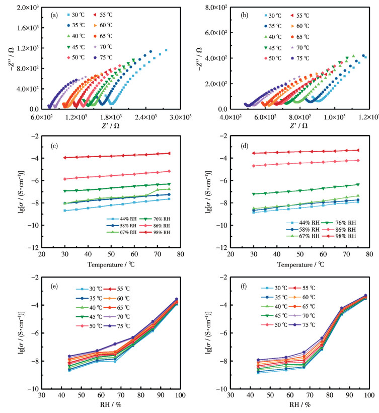 Figure 4  Nyquist plots of La-1 (a) and La-2 (b) at 98% of RH; Temperature-dependent σ values for La-1 (c) and La-2 (d); Plots of lg σ against RH of La-1 (e) and La-2 (f) at different temperatures