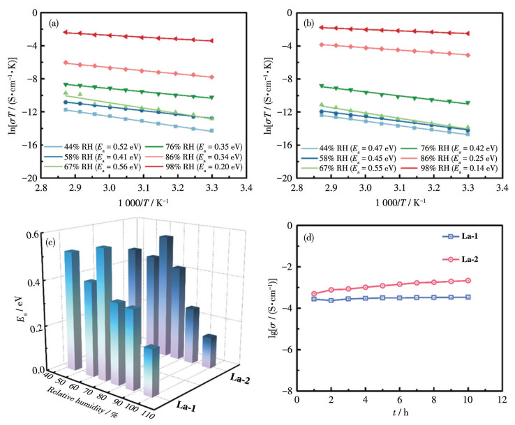 Figure 5.  Arrhenius plots for the proton conductivity of La-1 (a) and La-2 (b) under different RH conditions; (c) Values of Ea under different RH conditions; (d) Time-dependent σ values of La-1 and La-2 at 75 ℃ and 98% of RH