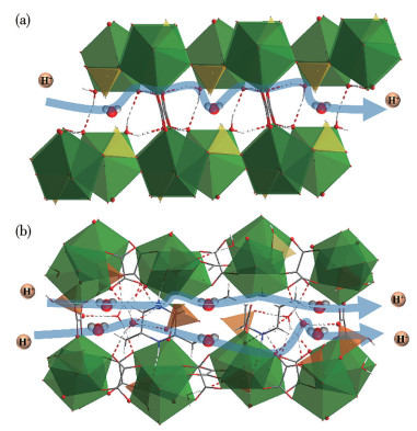 Figure 6  Schematic representation of proton transport in La-1 (a) and La-2 (b)