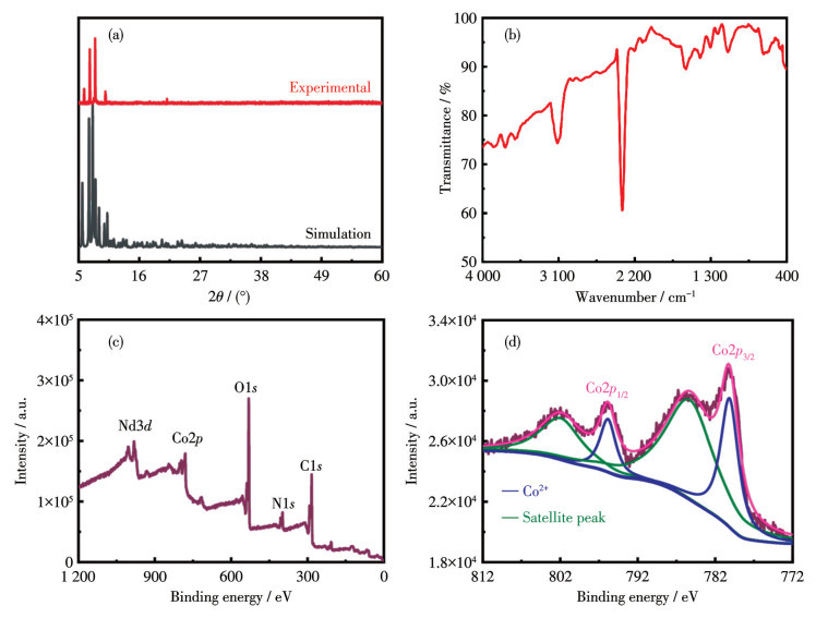 为确定NdCo6-py的纯度,对样品进行了PXRD测试。得到的PXRD图与单晶结构模拟图一致,证明了NdCo6-py晶体具有较高的相纯度(图 2a)。为了辅证单晶结构数据解析结果,对样品进行了红外光谱表征(图 2b),图中在1 400和1 600 cm-1附近出现的伸缩振动峰以及1 100 cm-1附近的变形振动峰归属于吡啶环上的C=C键、C=N键和C—H键,而3 100 cm-1附近的中等强度的伸缩振动峰则归属于py和Haib上的C—H键,这表明了具有2种配体的NdCo6-py的成功合成[32-33]。TGA结果表明配合物在室温到230 ℃之间缓慢失重,这与晶体中吸附的溶剂分子和结晶水的失去相关;230 ℃之后配合物结构框架开始缓慢坍塌(图S1)[33]。XPS测试结果(图 2c、2d、S2)证明了NdCo6-py中的钴为Co2+。对合成的NdCo6-py在醋酸钠-醋酸缓冲液(pH=6)中的UV-Vis吸收光谱进行了收集。从UV-Vis光谱(图S3a~S3c)观察到在526 nm出现Co2+的d-d特征跃迁峰,而372 nm附近吸光度与浓度间良好的线性关系则说明配合物在醋酸钠-醋酸缓冲液中的稳定性。