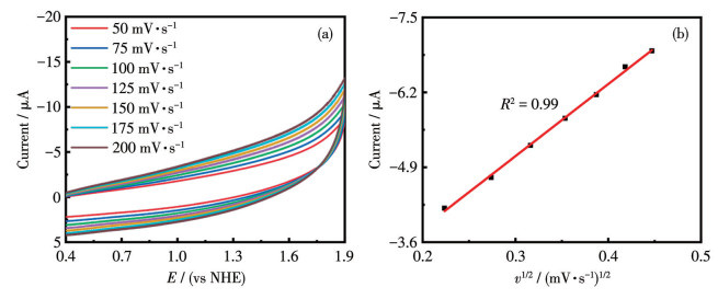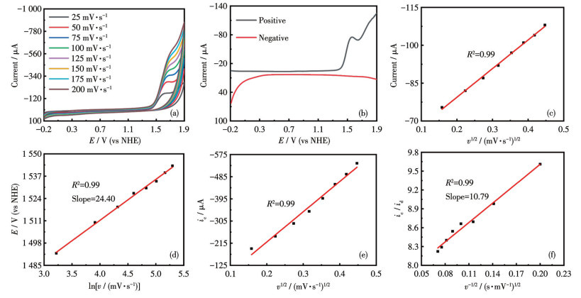 Figure 6 (a) CV curves with different scan rates, (b) DPV curves in different scanning directions, (c) plot of the oxidative peak current vs the square root of the scan rate at E1/2=1.45 V, (d) linear plot of Ep, 1/2 of the anode peak at 1.50 V (vs NHE) and ln v, (e) plot of the catalytic peak current at 1.60 V (vs NHE) vs the square root of the scan rate, (f) plot of the ratio of the catalytic peak current at 1.60 V to the diffusion current at 1.40 V (ic/id) vs v-1/2 of 0.25 mmol·L-1 NdCo6-py in sodium acetate-acetate buffer (pH=6)