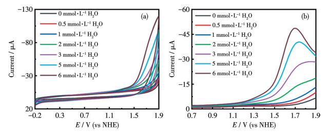 分别在超干乙腈(含有0.1 mol·L-1的Et4NClO4)和醋酸钠-醋酸缓冲液中,通过CV和DPV研究了NdCo6-py的氧化还原特性。NdCo6-py在乙腈溶液中的CV曲线在1.50 V(vs NHE)后呈现出不可逆的氧化过程(图 3a),氧化电流与扫描速率的平方根呈线性关系(图 3b),表明氧化过程受扩散控制。为进一步验证NdCo6-py在非催化水氧化状态下的氧化还原特性,测试了NdCo6-py的乙腈溶液中加入不同浓度的水后的CV和DPV曲线(图 4a和 4b)。CV曲线在1.50 V(vs NHE)左右出现了明显的阳极肩峰,随反应体系中水浓度增加,催化氧化峰电流持续上升,这也印证了水氧化的发生。观察DPV曲线发现随着水的浓度的上升,氧化电位不断负移,这表明配合物在催化反应过程中与水的配位有助于降低氧化起始电位。