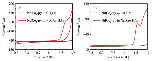 进一步,我们利用Laviron方程(Eq.S2)确定氧化过程涉及的电子转移数nd。由于1.50 V(vs NHE)左右的阳极肩峰难以准确定位,为了确定扩散电流对应的nd,利用半峰电位Ep, 1/2和ln v存在的线性关系[36](图 6d),通过线性拟合得到直线的斜率为RT/ [(1-α)ndF],传递系数α取0.5,计算得到nd=2,因此在1.50 V(vs NHE)处发生了双电子氧化转移过程。另外,1.60 V(vs NHE)处催化峰电流与扫描速度的平方根呈现良好的线性关系(图 6e),进一步说明了水氧化反应是由扩散过程控制的[37]。通过以上分析,我们可以确定合成的NdCo6-py中2个Co离子可视为等效的单电子反应基团[38],1.50 V(vs NHE)处的双电子氧化转移过程可以分配给NdCo6Ⅱ/NdCo4ⅡCo2Ⅲ氧化反应对,1.50 V(vs NHE)后的不可逆氧化过程表明了水氧化过程的发生,说明NdCo6-py具有催化水氧化性能。