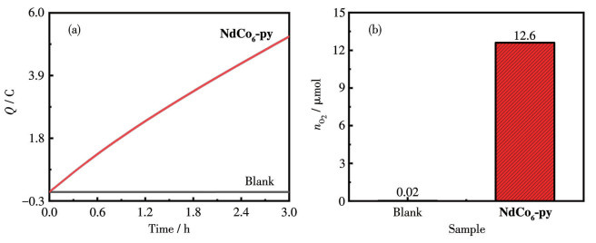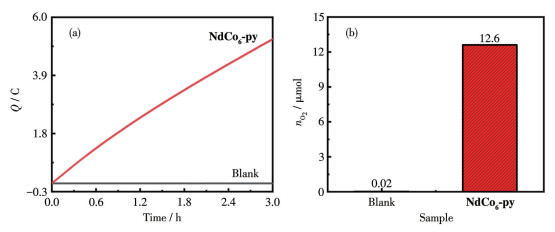 通过氧化铟锡(ITO)电极收集NdCo6-py的LSV曲线(图S5),1.40 V(vs NHE)后显著增加的催化电流证明了水氧化反应的进行,达到1 mA·cm-2所需的电势为1.53 V(vs NHE),过电势为654 mV。为了考察氧气的产生,利用气密性双隔室电解池(阴极室和阳极室由Nafion膜隔开),在1.60 V(vs NHE)处进行3 h的CPE实验(图 7a和 7b)。电解结束后,用气相色谱法检测产生的氧气约为12.6 μmol,法拉第效率为92.6%(Eq.S1),更重要的是还检测到产生的H2和O2的比例为2∶1(图S6),验证了水分解反应的发生[39]。