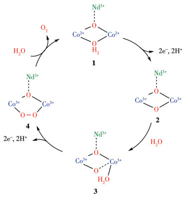 为了进一步探究NdCo6-py催化水氧化的机理,我们利用DPV测试了NdCo6-py在不同pH的醋酸钠-醋酸缓冲溶液中的催化性能的变化(图 8a)。从图中可看出随pH减小,1.50 V(vs NHE)附近的氧化峰的峰电位不断增加,这说明反应过程涉及PCET[41]。峰电位的变化表明了在不同pH条件下NdCo6-py的催化水氧化活性存在差异,总体上随pH的增加,催化峰电位不断负移。对氧化峰电位和pH进行线性拟合,得到NdCo6-py在醋酸钠-醋酸缓冲溶液中的Pourbaix图(图 8b),发现在1.50 V附近的氧化电位随pH变化的斜率约为-58 mV,符合2e-/2H+ PCET过程(能斯特理论值为-59 mV)[42],对应了催化水氧化过程的NdCo6Ⅱ/NdCo4ⅡCo2Ⅲ氧化反应对。结合电化学实验结果和具有相似结构的配合物的催化机理报道[33, 43-44],我们提出了在弱酸条件下NdCo6-py催化水氧化的可能机理(图 9)。如图所示,催化水氧化过程起始于NdCo6-py上的双金属反应位点[Co2(NO3)]。首先,NO3-解离并与H2O配位,形成催化循环的起始物种[Co2+-OH2-Co2+]。随后经历一次2e-/2H+的PCET过程,转变为中间体[Co3+-O-Co3+]。接着该中间体受到另一H2O分子的亲核攻击,生成[(Co3+-O)(Co3+-H2O)]中间体。然后,再通过另一次2e-/2H+的PCET过程氧化,形成含有O—O键的[Co3+-O-O-Co3+]单元。最后释放出O2,并与一分子水配位,从而恢复到起始状态,完成整个催化循环。