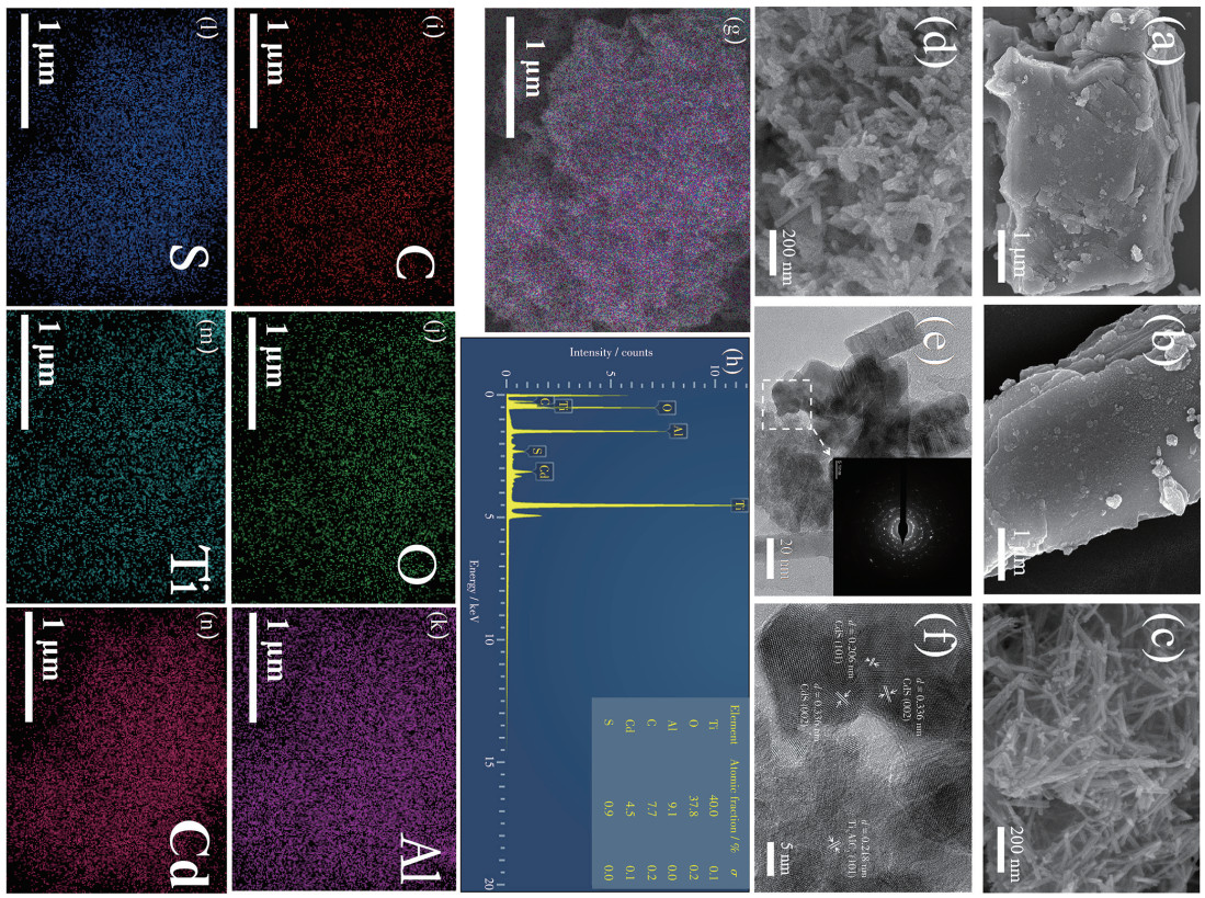 SEM and EDS analyses were conducted to examine the surface morphology and elemental composition of the samples. As shown in Fig.2a, pristine Ti3AlC2 exhibited a characteristic layered structure[10, 15]. After calcination (Fig.2b), the morphology remained largely unchanged, indicating structural stability. Pure CdS (Fig.2c) displayed a dendritic structure, offering numerous active sites for photocatalysis[28]. In the 5%CdS/Ti3AlC2 heterostructure (Fig.2d), CdS particles formed a rod-like accumulation on the Ti3AlC2 surface, suggesting effective surface modification for enhanced light absorption. TEM (Fig.2e, 2f) confirms the crystalline nature of both CdS and Ti3AlC2, with distinct lattice fringes and tight contact, indicating successful heterojunction formation[10, 29]. The EDS spectrum (Fig.2g, 2h) verifies the presence of Ti, Al, C, O, Cd, and S elements, indicating that CdS was successfully incorporated at approximately 5%, which was in line with the designed composition. Furthermore, the single elemental mapping shows uniform distribution of Cd, S, Ti, Al, and C (Fig.2i-2n), confirming homogeneous CdS incorporation while preserving Ti3AlC2′s structural integrity[30-31]. These results highlight the effective structural modification of Ti3AlC2 by CdS, which enhances photocatalytic performance.