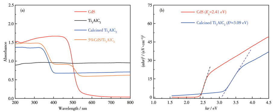 Photocatalytic oxidation is an efficient and eco-friendly method for degrading organic pollutants without secondary pollution[7-8]. However, conventional semiconductors suffer from wide band gaps (3.0-3.2 eV), low sunlight utilization (3%-5%), and high electron-hole recombination rates, limiting their photocatalytic performance[9]. To overcome these challenges, researchers have explored the integration of advanced materials into semiconductor systems[10]. Recently, layered ternary transition-metal carbides and nitrides, known as MAX phases, have garnered significant attention due to their distinctive two-dimensional (2D)-like structures and exceptional electrical conductivity[11]. Ti3AlC2, a material that is frequently utilized as a co-catalyst, has been shown to enhance charge separation when employed in conjunction with semiconductors. This enhancement can be attributed to the high conductivity, oxidation resistance, and self-healing capacity inherent to Ti3AlC2[12]. Furthermore, recent studies have demonstrated that Ti3AlC2 exhibits characteristics analogous to 2D materials, including a substantial surface area and interlayer diffusion pathways, which facilitate charge carrier migration[13-14]. Ti3AlC2 has also shown catalytic activity in oxidative reactions, improving both the photocatalytic activity and material durability when integrated into composite systems[15]. Given these findings, integrating CdS with Ti3AlC2 is expected to enhance charge separation and structural stability, improving UV-induced photocatalytic efficiency.
