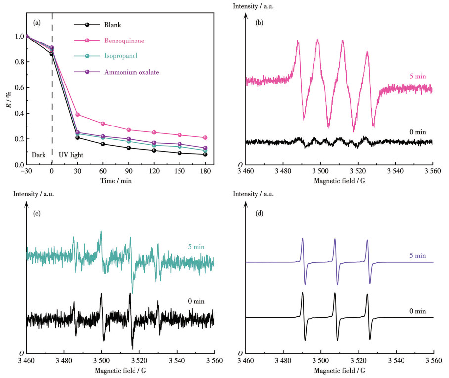 The crystal structure of the samples was determined by X-ray diffraction (XRD) using a Bruker D8 diffractometer equipped with Cu Kα radiation (λ=0.154 06 nm, 2θ=5°-80°) operated at 40 kV and 40 mA. The morphological characteristics were observed via scanning electron microscopy (SEM, Regulus 8100) and transmission electron microscopy (TEM, Talos F200X FEI, 200 kV). Energy-dispersive X-ray spectroscopy (EDS) analysis was conducted in conjunction with SEM to evaluate the elemental composition. Fourier transform infrared spectroscopy (FTIR) spectra (500-4 000 cm-1) were recorded using a Thermo Nicolet iS5 spectrometer. Ultraviolet-visible diffuse reflectance spectroscopy (UV-Vis DRS) measurements (200-800 nm) were conducted using an EVOLUTION 220 spectrophotometer. X-ray photoelectron spectroscopy (XPS) analysis was performed with a Thermo K-Alpha+ system. Transient photocurrent response was measured using an FLS1000 spectrometer and an electrochemical workstation. In addition, photoluminescence (PL) spectra were recorded using a Shimadzu UV-3600i Plus spectrophotometer. Transient photocurrent response (TPR) and electrochemical impedance spectroscopy (EIS) measurements were performed on an electrochemical workstation (CHI760E, Chenhua Instrument Co., Ltd., Shanghai, China). Electron paramagnetic resonance (EPR) spectroscopy (Bruker EMXplus-6) was employed to identify the active species generated during the photocatalytic process.