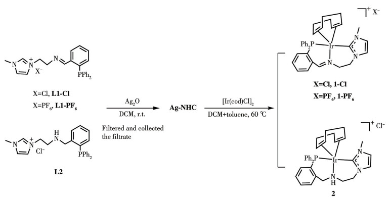The addition of [Ir(cod)Cl]2 to the silver-NHC complexes generated from L1-Cl, L1-PF6, and L2 with Ag2O, without isolation, afforded the corresponding NHC‑based iridium(Ⅰ) complexes, respectively (Scheme 1).