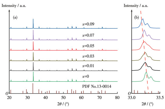 CAGO: xPr3+系列样品的XRD图如图 1所示。经对比发现,Pr3+掺杂的CAGO粉末的各个衍射峰与标准卡PDF No.13-0014高度匹配,无杂峰出现,说明荧光粉样品中Pr3+已经部分取代Cd2+进入了CAGO的晶格中,且CAGO: xPr3+样品的晶格并没有发生显著的变化。由XRD图可知,样品的衍射峰尖锐、强度高,表明本次实验合成的荧光粉样品结晶度良好,无明显畸变。图 1b中衍射峰向低角度偏移的现象可通过Bragg方程进行阐释: