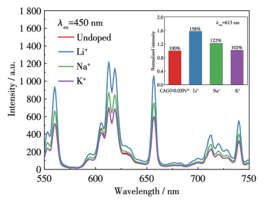 图 10展示了在不同电荷补偿离子M+的作用下CAGO的发射光谱以及荧光强度与掺杂离子的关系。如图 10所示,在掺杂碱金属离子后,除荧光强度发生变化外,其发射峰的形状和位置均无明显变化,这表明碱金属离子M+与Pr3+共掺杂CAGO荧光粉的晶体结构并没有发生显著的变化。从不同碱金属掺杂离子与荧光强度的关系中可以看到,光致发光的强度提升大小顺序为Li+ > Na+ > K+,且均高于未掺杂的样品CAGO: 0.03Pr3+。其中CAGO: 0.03Pr3+,0.03Li+的荧光强度是CAGO: 0.03Pr3+荧光粉的1.58倍(图 10插图)。碱金属离子与Pr3+共掺杂可以改善荧光粉的结晶度和颗粒尺寸,促进基质晶体的成相和晶粒生长[33],因此在荧光粉材料研究领域已被广泛应用于光致发光性能的优化[34]。