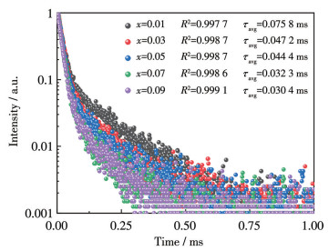 图 11为CAGO: xPr3+(x=0.01~0.09)在450 nm激发和613 nm波长监测下的荧光寿命衰减曲线。由于衰减曲线单指数拟合相关系数(R2=0.953)不及双指数拟合(R2=0.998)的效果好(R2越接近1表示线性拟合越好),故为了实验结果的严谨性,荧光衰减的曲线均由双指数公式进行拟合,公式如下所示[36]: