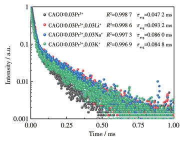 图 12为CAGO: 0.03Pr3+,0.03M+在450 nm激发和613 nm波长监测下的荧光寿命衰减曲线,可以发现碱金属离子的掺杂提高了荧光粉的荧光寿命,在CAGO中,Pr3+取代Cd2+会导致电荷失衡(+3价→+2价),引发Cd空位缺陷,这些缺陷作为非辐射复合中心,显著缩短了荧光寿命。通过共掺杂碱金属离子(Li+、Na+、K+)进行电荷补偿后,荧光寿命得到不同程度的提升,提升大小排序为Li+ > Na+ > K+,均高于未掺杂碱金属离子的体系,原因可以归结为较小半径的Li+可能优先占据晶格间隙而非取代Cd2+位点,从而避免了因半径不匹配(Dr=30.9%)导致的晶格收缩应力,同时通过间隙离子屏蔽缺陷。Na+的适中补偿,最佳半径匹配Na+与Cd2+的半径差异最小(Dr=7.3%),取代时晶格畸变较小,电荷补偿效率较高,但仍弱于Li+的动态迁移能力。而K+的较大半径,导致晶格显著膨胀,可能形成间隙氧或金属空位,从而引入新的非辐射复合通道[38]。