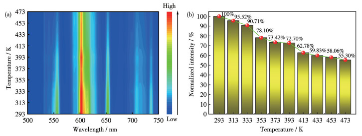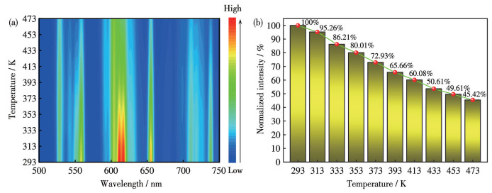 如图 13所示,CAGO: 0.03Pr3+在450 nm的激发下,以20 ℃为温度间隔,在293 K升温至473 K的过程中,发射峰的位置没有发生改变,但其发光强度随温度升高呈现梯度性衰减。其物理机制主要归因于热激活非辐射跃迁过程的显著增强:随着环境温度升高,晶格声子振动的无序性加剧,导致发光中心与晶格环境的耦合作用增强,从而强化了声子辅助弛豫路径。这种热致晶格弛豫效应使得激发态电子通过非辐射途径耗散能量的概率显著提升,最终表现为发光强度的温度依赖性衰减。