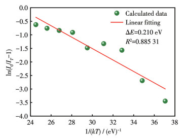 $ \ln \left(\frac{I_0}{I_T}-1\right)=\ln A-\frac{\Delta E}{k T} $ (6) 式中,I0和IT分别为室温和当前温度下的发光强度,ΔE和A分别为活化能和热猝灭常数,k为玻尔兹曼常数(8.62×10-5 eV·K-1),T为温度(K)。如图 14所示,通过拟合ln(I0/IT-1)与1/(kT)得到直线斜率为-0.210,因而其活化能为0.210 eV,说明具有较好的热稳定性[40]。