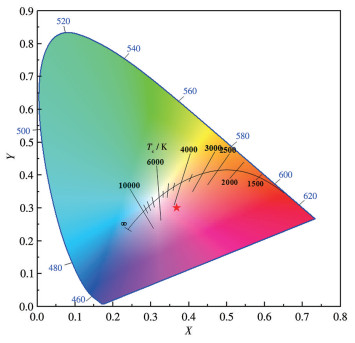 在荧光粉材料的性能表征中,色坐标与相关色温是2个关键参数。对于CAGO: xPr3+系列荧光粉,其在450 nm激发下的发光颜色特性可通过CIE 1931标准色度图进行可视化分析,相关色温(Tc)则基于McCamy提出的经验公式进行计算[41]: