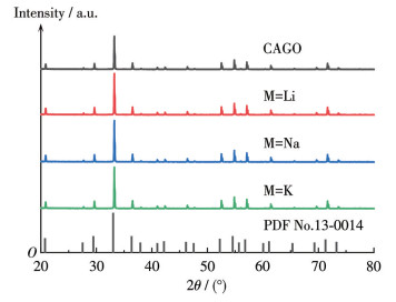 图 2为CAGO: 0.03Pr3+,0.03M+样品的XRD图。结果表明,所有掺杂样品的XRD图中均未检测到Li、Na、K单质或其氧化物(Li2O、Na2O、K2O)的特征衍射峰。这归因于碱金属离子(Li+、Na+、K+)的掺杂浓度较低(物质的量分数为0.03),以及Li+(r=0.076 nm)、Na+(r=0.102 nm)、K+(r=0.138 nm)的离子半径与Cd2+具有良好的匹配性,这促使碱金属优先占据Cd2+的格位。XRD结果证实,碱金属离子掺杂未显著改变CAGO的晶格结构。同时,掺杂后样品衍射峰尖锐且强度高,表明碱金属掺杂提升了材料的结晶度。