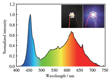 为了评估荧光粉的应用潜力,将合成的样品CAGO: 0.03Pr3+和适量的商用Ba2SiO4: Eu2+荧光粉混合涂覆在450 nm蓝光芯片上制成WLED器件。图 19是制作的WLED器件的色坐标,图 20是WLED器件的电致发光光谱以及未发光和发光效果照片(插图),测试电压为3.3 V,电流为125 mA。由WLED照片可以看出,器件发射出明亮的白光。其CIE色坐标为(0.368 2,0.300 1),位于白光圈内,色温为3 628 K,显色指数(Ra)为90.2。所有结果表明,CAGO: 0.03Pr3+荧光粉是一种很有前途的WLED用橙色荧光粉。