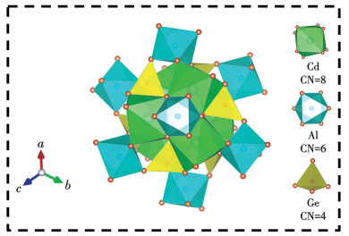 为了进一步探究Pr3+在基质中的晶格取代,绘制了CAGO的晶体结构示意图(图 3)。如图所示,CAGO属于石榴石结构,其中Cd2+、Al3+和Ge4+分别与8、6和4个氧离子结合形成十二面体、八面体和四面体结构。在反应过程中,离子取代反应有可能发生。从理论上而言,若要实现离子取代,掺杂离子与取代离子的半径差百分比(Dr)临界值不高于30%。该Dr可以用下列公式进行近似计算[20]: