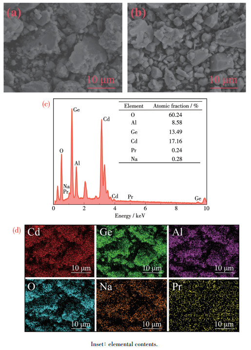 图 4a和4b分别为CAGO: 0.03Pr3+和CAGO: 0.03Pr3+,0.03Na+的SEM表面形貌图。结构显示,Na+掺杂样品呈现典型的烧结团聚结构,晶粒尺寸较CAGO: 0.03Pr3+显著增大,这归因于Na+的助熔剂效应降低了液相烧结温度,促进了晶粒的定向生长。同时所有样品的粒径均控制在104 nm以下,颗粒呈现不规则多面体形态且存在轻微团聚,这是由于在1 300 ℃的高温合成过程中,表面能驱动大晶粒界面向小晶粒中心扩张,导致晶粒尺寸变大,该现象与XRD图中衍射峰强度增强的结果一致[21]。图 4c和4d为CAGO: 0.03Pr3+,0.03Na+的EDS分析结果表明荧光粉由Cd、Al、Ge、O、Pr等组成,受EDS检测精度限制,未观察到Na元素信号。Cd、Al、Ge、O的原子比接近于目标产物(Cd2.94Al2Ge3O12: 0.03Pr3+,0.03Na+)的化学计量比。同时CAGO荧光粉的元素分布图进一步证实了Pr3+和Na+通过替代Cd2+成功进入CAGO基质,结果表明,高温固相法能够有效制备高纯度的CAGO: 0.03Pr3+,0.03Na+荧光粉材料。