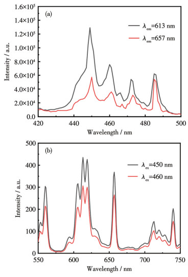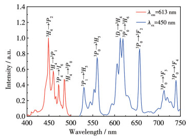 图 5a和5b分别为CAGO: 0.03Pr3+在不同发射和激发波长下的光谱图,其中,最佳发射与激发波长分别在613与450 nm下得到。