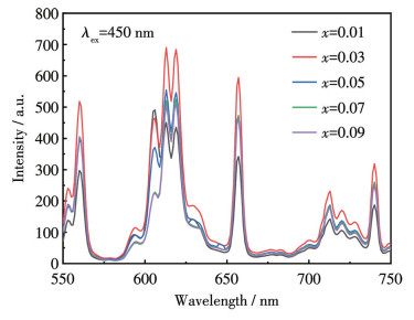 图 7是CAGO: xPr3+(x=0.01~0.09)荧光粉在5种不同浓度下样品的发射谱图。从图 7可知,随着Pr3+掺杂浓度的改变,CAGO: xPr3+(x=0.01~0.09)荧光粉的发射峰位置和形状并没有明显的改变。随着Pr3+掺杂浓度的增加,CAGO: xPr3+(x=0.01~0.09)荧光粉的发光强度呈现出先上升后下降的变化趋势[26]。实验数据表明,当Pr3+掺杂浓度达到0.03时,荧光粉的荧光强度达到最大值。进一步提高掺杂浓度时,由于Pr3+离子间距离缩短,相邻离子间的能量传递过程显著增强,导致发光中心的非辐射跃迁概率增大,引发荧光粉的浓度猝灭。