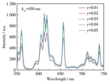 图 9展示了CAGO: 0.03Pr3+体系中不同质量分数Li+掺杂样品的荧光光谱。结果表明,除发射强度呈现规律性变化外,各光谱的峰形与峰位均保持稳定。在450 nm激发波长下,荧光发射强度随Li+掺杂量增加呈现先升后降趋势。当Li+掺杂量为0.03时,荧光强度达到峰值;继续增大掺杂浓度,发射强度则逐渐衰减。这是因为适量的Li+掺杂到荧光粉中,能够将能量从基质传递到发光Pr3+激活剂,增强发光中心Pr3+对能量的吸收,但金属离子掺杂过量会导致能量吸收减弱[32]。