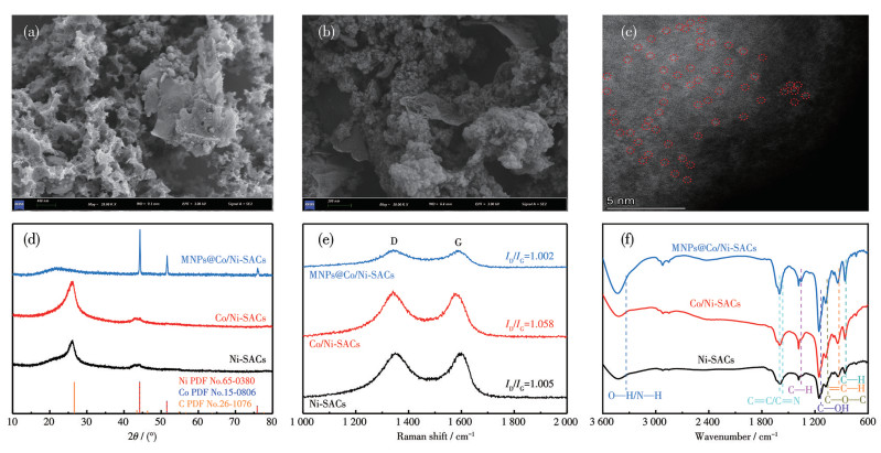 图 2  (a) MNPs@Co/Ni-SACs和(b) Co/Ni-SACs的SEM图; (c) Co/Ni-SACs的HAADF-STEM图; MNPs@Co/Ni-SACs、Co/Ni-SACs和Ni-SACs的(d) XRD图、(e) 拉曼谱图和(f) FTIR谱图