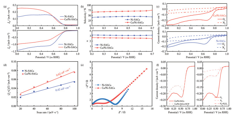 Figure 4  (a) ORR LSV curves, (b) H2O2 selectivity (up) and the number of transferred electrons (down), (c) CV curves, (d) electrochemical active surfaces, and (e) EIS of Co/Ni-SACs and Ni-SACs; (f) LSV curves before and after adding KSCN in alkaline electrolyte solution (light) and H2O2RR curves (right) of Co/Ni-SACs