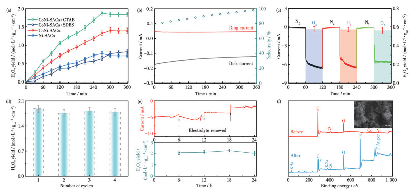 图 5  催化剂电催化合成H2O2的性能: (a) 不同催化体系催化合成H2O2的产量-时间曲线; (b) 0.4 V (vs RHE)下Co/Ni-SACs电催化反应过程中的盘电流、环电流和选择性曲线; (c) 每60 min交替通入N2和O2时电流响应和H2O2产量曲线; (d) Co/Ni-SACs催化合成H2O2的循环利用性; (e) Co/Ni-SACs长时间催化合成H2O2的电流响应和产量曲线; (f) 催化前后Co/Ni-SACs的XPS全谱图