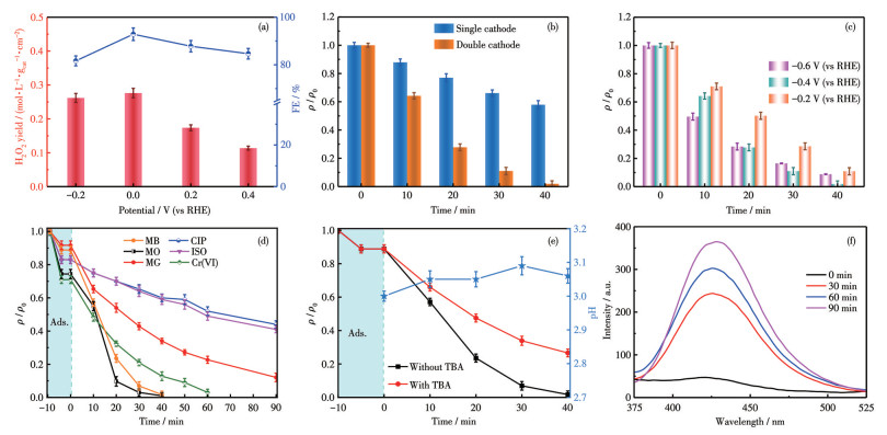 Figure 6  (a) H2O2 yield and FE of Co/Ni-SACs for electrocatalytic ORR towards H2O2 production at different potentials in 0.1 mol·L-1 Na2SO4 (pH=3); (b) Bar chart of degradation efficiency for MB with different electrode systems; (c) Effect of the second cathode potential on the degradation efficiency of MB; (d) Degradation efficiency of various pollutants in double-cathode electro-Fenton system; (e) ·OH trapping experiments and pH variation curve of the solution near the electrode, and (f) fluorescence spectra for detecting the generated ·OH at different times using a fluorescent probe during MB degradation in the dual-cathode electro-Fenton system