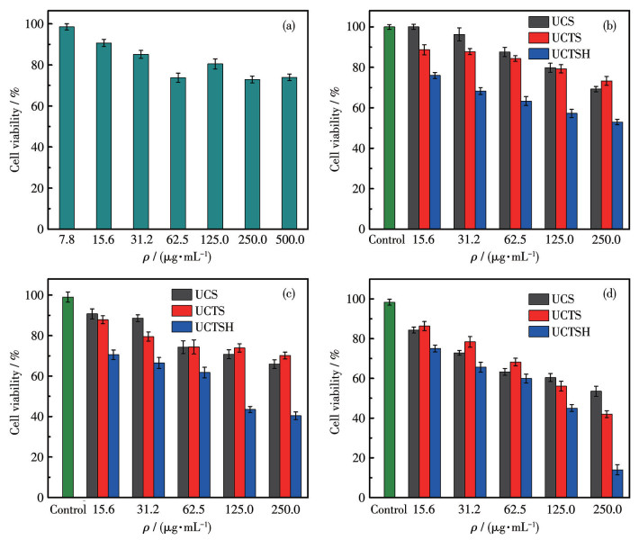 Figure 6  (a) Cell viability of L929 incubated with UCTSH at various mass concentrations; (b) Viability of MCF-7 cells after incubation with UCS, UCTS, and UCTSH without irradiation; (c) Viability of MCF-7 cells after incubation with UCS, UCTS, and UCTSH with irradiation for 5 min by an 808 nm laser; (d) Viability of MCF-7 cells after incubation with UCS, UCTS, and UCTSH with irradiation for 10 min by an 808 nm laser