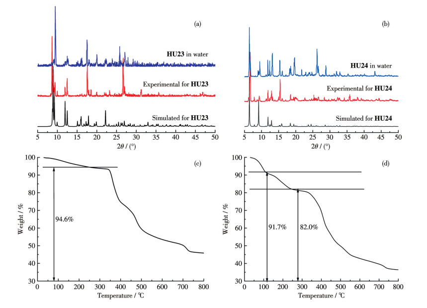 To investigate the phase purity of the bulk products, PXRD measurements were performed on the synthesized HU23 and HU24 samples. The test results indicated that the experimental patterns agreed with the simulated ones derived from their single-crystal structures, confirming the phase-pure nature of the prepared materials. Additionally, the stability of HU23 and HU24 samples was examined through water immersion tests. After 3 d of soaking in water, no observable changes occurred in either sample (Fig.3a and 3b). Subsequent PXRD analyses revealed maintained consistency between experimental and simulated patterns, demonstrating that both HU23 (synthesized via hydrothermal method) and HU24 (prepared through solvothermal approach) have aqueous stability.