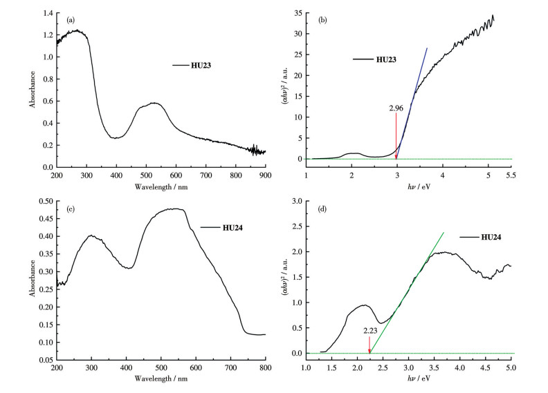 Figure 4  UV-Vis absorption spectra (a, c) and band gaps based on the K-M method (b, d) of HU23 and HU24