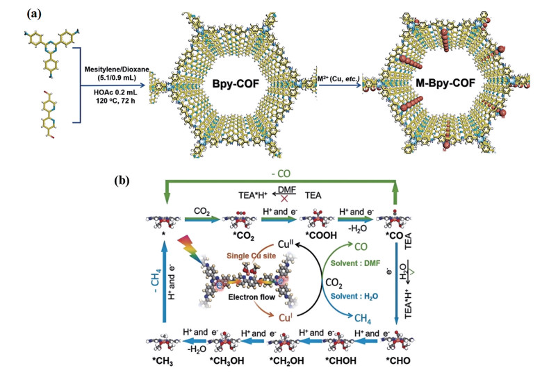 Figure 12. (a) Schematic representation of Bpy-COF and M-Bpy-COF; (b) Proposed reaction mechanism for photocatalytic CO2 conversion over Cu-Bpy-COF[115]2.2 CO as the main reduction product